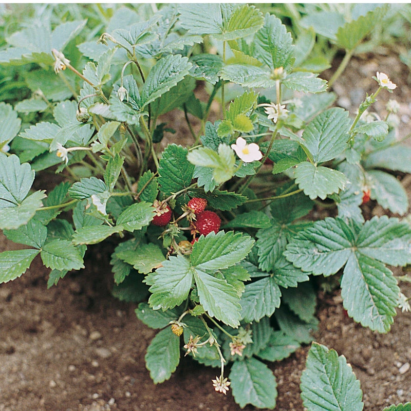 Day-neutral. A gourmet treat and easy landscape plant. These decorative little plants produce delicious, aromatic red strawberries, about twice the size of wild berries but much smaller than the standard type. Perennials, Alpine strawberries stay compact and produce few runners, making them suitable for rock gardens, path edgings, pots, and window boxes. They begin producing the second spring, sometimes the first fall. Grows best in Zones 5-8.