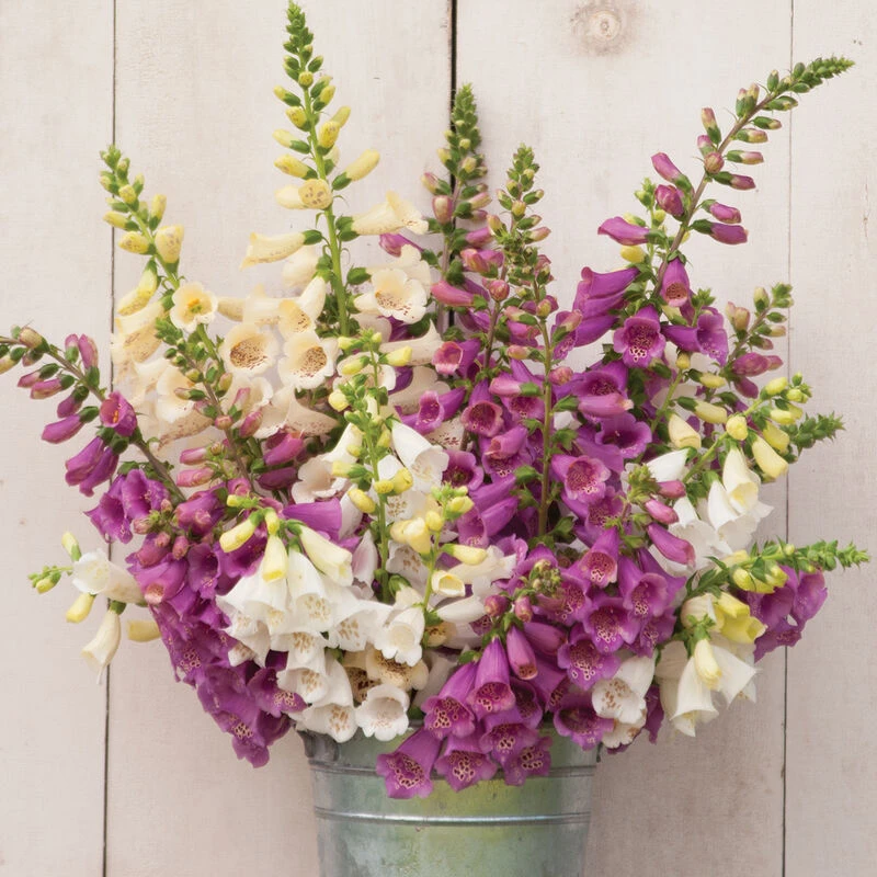 A combination of four lovely colors: cream, lavender, rose, and white. Center spikes are large and full, and side shoots fill out the plant. Great for bouquets and gardens. Best when treated as a fall or spring-planted hardy annual, as winter survival is generally poor when treated as a perennial. Also known as purple foxglove. Pelleted seeds.