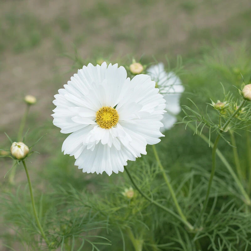 Early, prolific white cosmos with unique tufted centers.