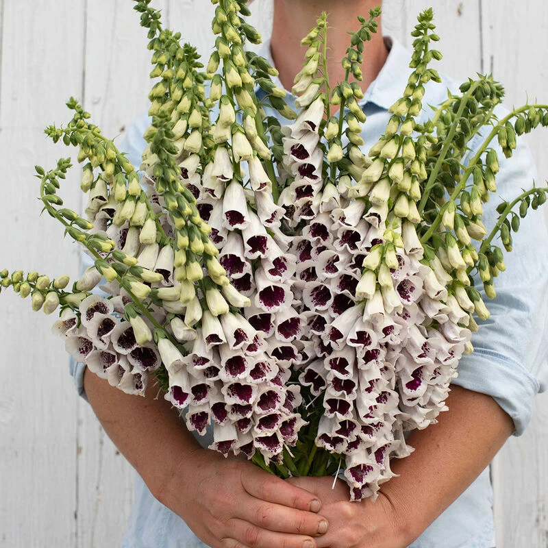 Second-year flowering. White bells with dark plum-colored throats and freckles. Bells form on one side of the stem. A nice complement to Sugar Plum digitalis. In our trials, Pam’s Choice produced 3–5 tall stems and 2–3 shorter, secondary stems per plant. Can be fall or spring-planted. NOTE: Flowering occurs in late spring in the second season of growth.