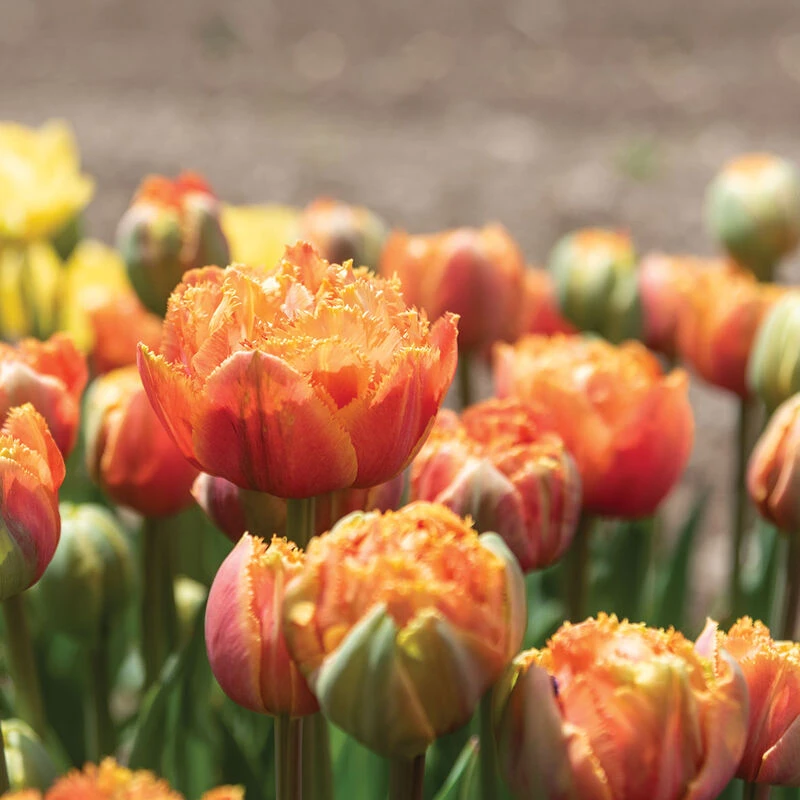 Immense 3–4″ bowl-shaped blooms — among the most “fully double” varieties we’ve seen in our tulip trials. Countless layers of petals in shades of apricot, rosy pink, and green which transition to a glowing peachy gold as the blooms mature. Delicately fringed petals. Very uniform in height and bloom size. Lightly fragrant. Sturdy stems. NOTE: Bulbs do not come pre-chilled; if growing in hardiness Zones 8–10, see growing information (below) for pre-chilling instructions.