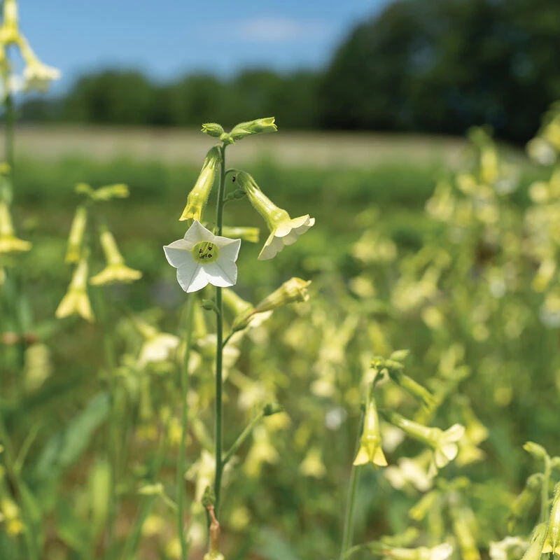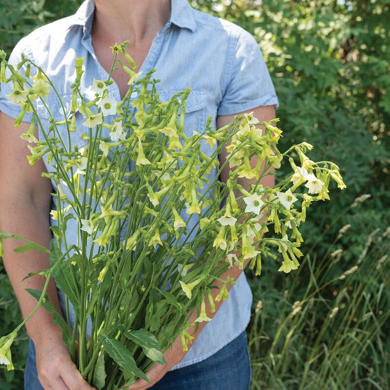 Star-shaped bells are lime and cream-colored on the outside throat, opening to 1″ wide ivory flowers. Grows easily from seed and is quick to flower in the field. Nicotiana flowers continuously for most of the season when cut back regularly. Blooms are relatively fragile and have a short vase life (5–7 days), making them best for casual bouquets, design work (not requiring a long vase life) and home cutting gardens. A favorite of pollinators and hummingbirds. Also known as flowering tobacco.